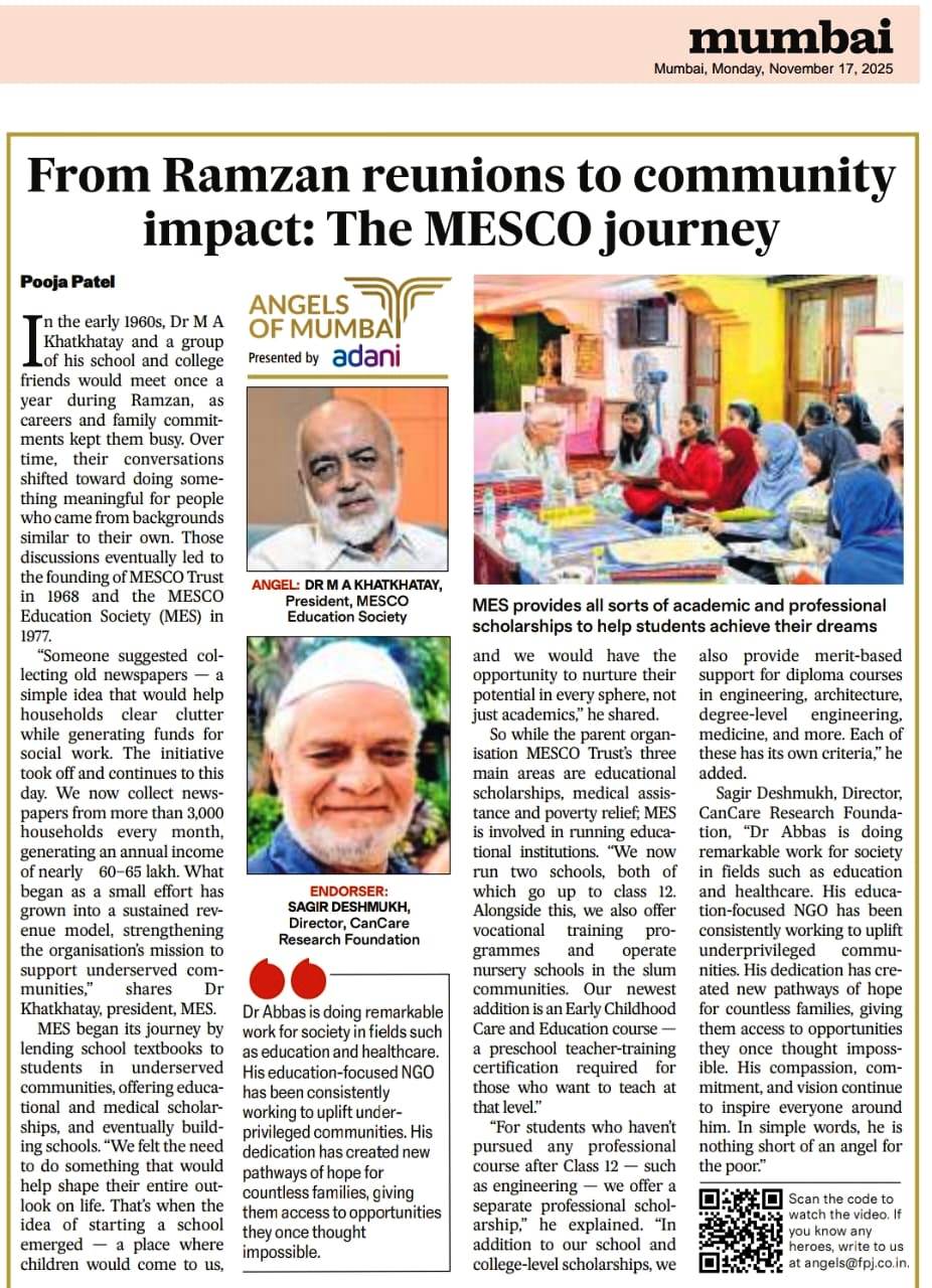 Crescent Degree College Plan | MESCO Ex-Students Directory | MESCO Trust & MES: Transforming Lives | | ECCED Handbill 2024 | | Principal Advertisement for Radiant School | | MESCO Zakat Appeal | | MKCL Authorized Learning Centre | | 80G Benefits | | Obituary | | Usage of Interest Money | | Nursery Sponsorship Appeal | | MESCO Old Newspaper Scheme | | CSR Initiative | | Payroll Appeal | | Radio One (94.3) Interview on MESCO |