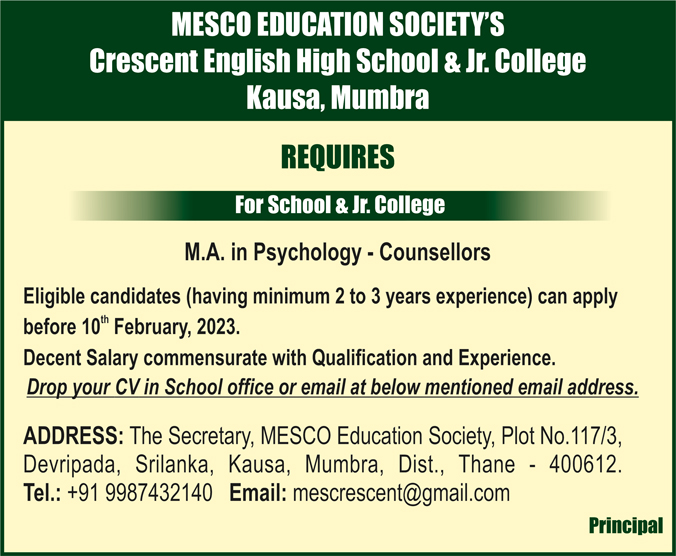 Crescent Degree College Plan | MESCO Ex-Students Directory | ECCED Handbill 2023 | | Principal Advertisement for Radiant School | | . MESCO Zakat Appeal | | MKCL Authorized Learning Centre | | 80G Benefits | | Obituary | | Usage of Interest Money | | Nursery Sponsorship Appeal | | MESCO Old Newspaper Scheme | | CSR Initiative | | Payroll Appeal | | Radio One (94.3) Interview on MESCO | | s |
